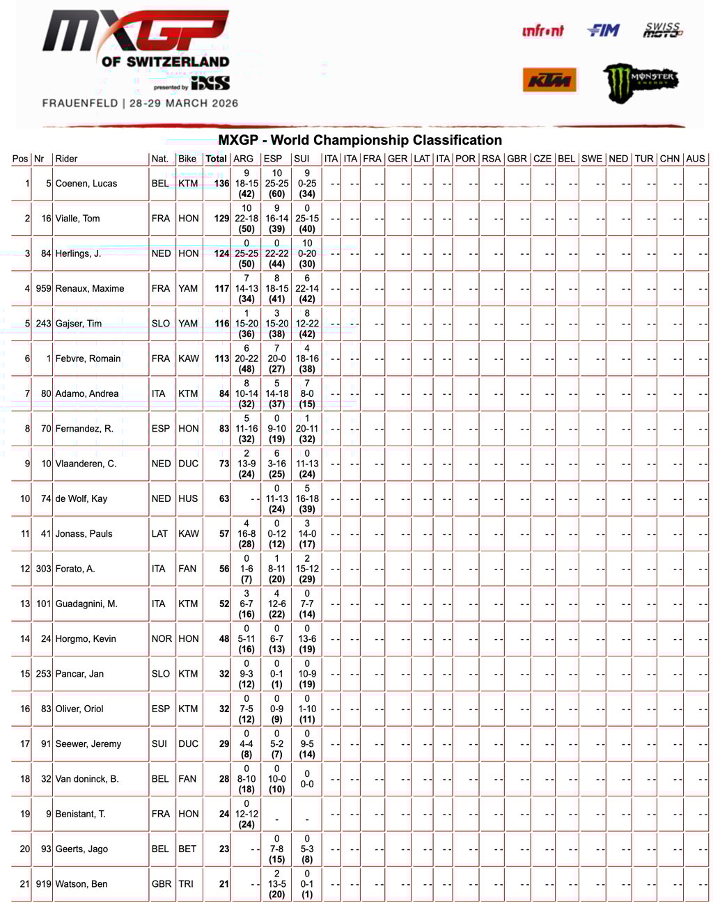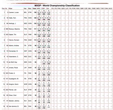 En la general del campeonato, y sumando también los puntos del sábado, el golpe de efecto lo da Lucas Coenen, que pese al desastre de la primera manga sale como líder con 136 puntos. Tom Vialle se coloca segundo a solo siete puntos, con 129 puntos, mientras Jeffrey Herlings queda tercero con 124. La lectura es clara: el campeonato está completamente abierto, pero también empieza a definirse un patrón. Coenen es el más rápido cuando todo encaja, Vialle el más fiable cuando todo se rompe, y Herlings sigue ahí, esperando su momento.
