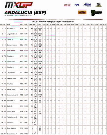La primera manga de MX2 en Almonte estuvo marcada por el golpe de autoridad de Guillem Farrés, que firmó una victoria de mucho peso en un circuito de arena exigente, demostrando solidez y control de carrera en un contexto donde muchos pilotos cometieron errores