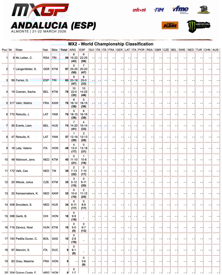 Tras la cita de Almonte, McLellan lidera el Mundial con 99 puntos, seguido muy de cerca por Langenfelder con 97, mientras Farrés se mantiene tercero con 80, por delante de Coenen con 78 y Valin con 76.