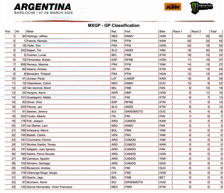 El Mundial de MXGP 2026 arrancó en el Gran Premio de Argentina, disputado en Bariloche, y lo hizo con un nombre propio por encima del resto: Jeffrey Herlings. El neerlandés firmó un domingo impecable para llevarse el triunfo absoluto del fin de semana y salir del primer gran premio del año como líder del campeonato.