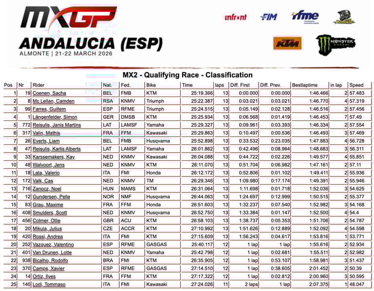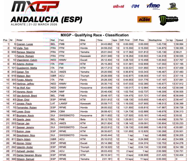 A partir de ahí la prueba tuvo un dominador claro, Coenen impuso un ritmo sólido y constante, sin errores, gestionando la carrera de principio a fin para asegurarse la victoria en la manga clasificatoria, por detrás Vialle rodó en tierra de nadie durante toda la prueba, sin oposición real, firmando una cómoda segunda posición pero sin opciones de discutir el triunfo