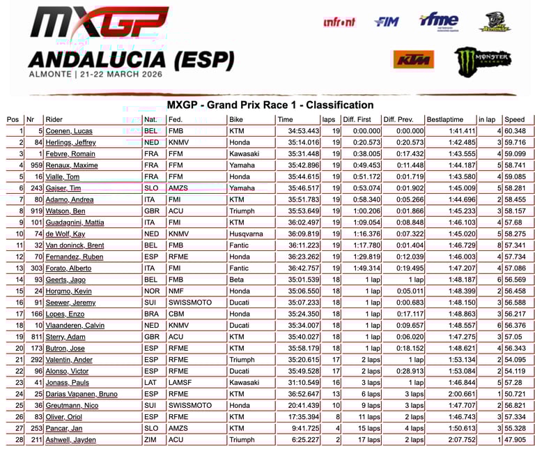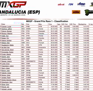 La segunda ronda del Mundial de MXGP en Almonte arrancó con la primera manga de la categoría reina, donde Lucas Coenen ofreció una exhibición incontestable dominando de principio a fin, el belga impuso un ritmo muy superior desde las primeras vueltas, abriendo rápidamente una ventaja de más de 11 segundos sobre Jeffrey Herlings y más de 20 respecto a Romain Febvre