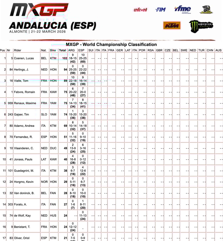 En ese contexto, Gajser heredó la tercera posición y confirmó su progresión durante el fin de semana, mientras que por delante Coenen cerraba otra actuación impecable, firmando un doblete contundente en Almonte, con Herlings nuevamente segundo