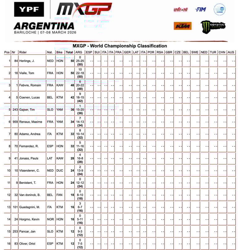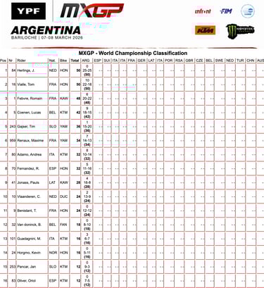 Jeffrey Herlings llega a Andalucía como máximo favorito, sin discusión, no solo por su estado de forma y su liderato en la clasificación genral, sino porque este tipo de terreno es su hábitat natural, la arena es su territorio, donde marca diferencias, donde convierte carreras en exhibiciones y donde, si todo va como se le espera, debería imponer su ritmo desde el inicio. Pero no lo tendrá sencillo, porque el campeonato llega con Romain Febvre y Tom Vialle instalados en el top 3, dos pilotos muy explosivos que, sin duda, van a aprovechar al máximo el buen trabajo realizado en el circuito argentino hace apenas dos semanas.